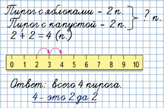 5. К празднику мама испекла 2 пирога с яблоками и столько же пирогов с капустой. Сколько всего пирогов испекла мама?