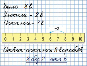 4. На кусте сидело 8 воробьёв. Улетели 2 воробья. Сколько воробьёв осталось?