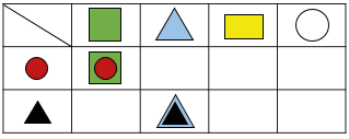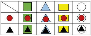 В каждом столбике рисую фигуры из образца: зелёный квадрат, синий треугольник, жёлтый прямоугольник и белый круг.