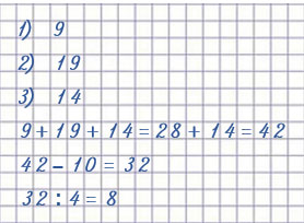 Найди сумму трех выписанных чисел. Полученную сумму уменьши на 10 и результат раздели на 4. Если в ответе получишь 8, то ты все сделал правильно.