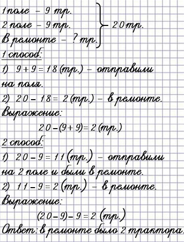 10. В хозяйстве было 20 тракторов. На одно поле отправили 9 из них, на другое - столько же, а остальные были в ремонте. Сколько тракторов было в ремонте?