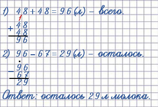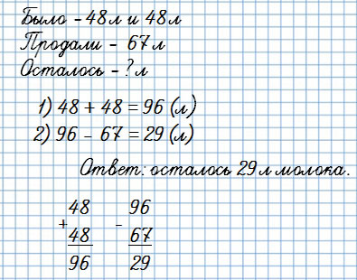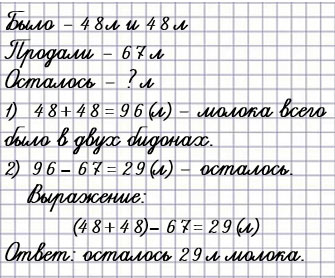 11. В одном бидоне было 48 л молока, а в другом - столько же. Сколько литров молока осталось, когда продали 67 л?