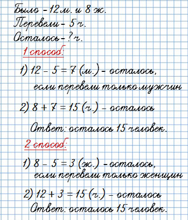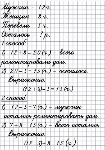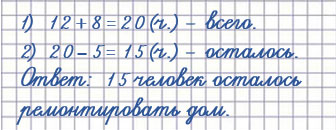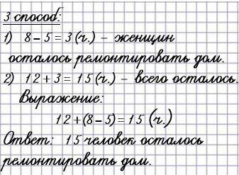 13. Дом ремонтировали 12 мужчин и 8 женщин. 5 человек из них перевели на другую работу. Сколько человек осталось ремонтировать дом?