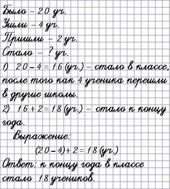 15. В начале учебного года в классе было 20 учеников. В течение года 4 ученика перешли в другие школы. За это время в класс поступили 2 новых ученика.