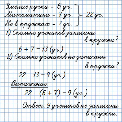 1) 6 + 7 = 13 (уч.) - записались в кружки.