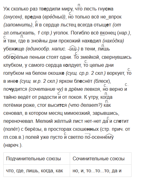 1. Уж сколько раз тв..рдили миру что лесть гнус(?)на вр..дна но только всё не(в)прок и в сердце льстец всегда отыщ..г уголок. (И. Крылов) 2. Погибло всё (в)конец и там где в знойны дни прохожий нах..дил убеж..ще в тени лишь обг..релые пеньки стоят одни. (И. Крылов) 3. То змейкой свернувшись клубком у самого сердца к..лдует то целые дни голубком на белом окошк.. воркует то в ине.. ярком бл..снёт, поч..дится в дрёме левкоя но верно и тайно ведёт от радости и от покоя. (А. Ахматова) 4. К утру, когда потёмки роже, стог высит(?)ся как сеновал, в котором месяц мимоезжий, зарывшись, переночевал. (Б. Пастернак) 5. Мелкий жёлтый лист нет-нет да и сл..тит с берёзы, в просторах скоше(н, нн)ых полей уже пусто и светло (по)осеннему. (В. Набоков)