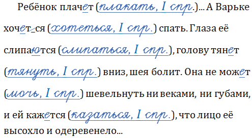 Ребёнок плачет (плакать, I спр.)... А Варьке хочет_ся (хотеться, I спр.) спать. Глаза её слипаются (слипаться, I спр.), голову тянет (тянуть, I спр.) вниз, шея болит. Она не может (мочь, I спр.) шевельнуть ни веками, ни губами, и ей кажется (казаться, I спр.), что лицо её высохло и одеревенело...