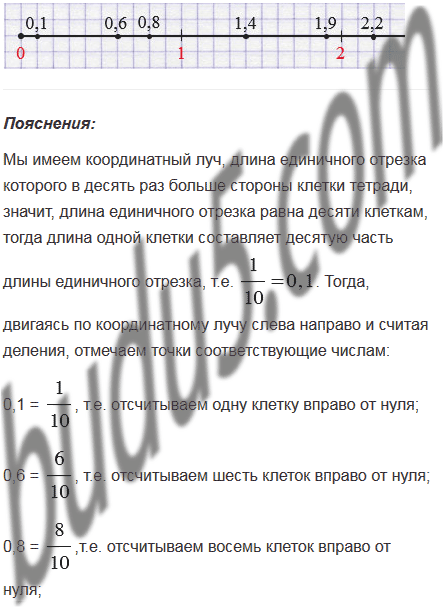 Начертите координатный луч, взяв за единичный такой отрезок, длина которого в десять раз больше стороны клетки тетради. Отметьте на луче точки, соответствующие числам 0,1; 0,6; 0;8; 1,4; 1,9; 2,2.