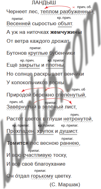 1. Используя текст стихотворения, докажите, что способность причастия передавать признак предмета как действие является выразительным средством в художественном тексте. Для этого спишите стихотворение, обозначая прилагательные и причастия (одиночные и с зависимыми словами).