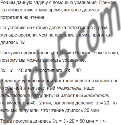 На чтение девочка потратила в 3 раза меньше времени, чем на прогулку. Сколько времени заняла прогулка, если она продолжалась на 40 мин больше, чем чтение?