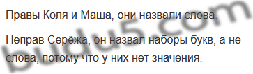 Ребята получили задание назвать два любых слова. Коля назвал «кошка, быстро», Маша — «дом, прыгать»; Серёжа — «фрык, кызя». Кто из ребят прав? Кто неправ? Почему?