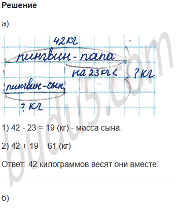 а) Масса пингвина-папы 42 кг, а его сына - на 23 кг меньше. Сколько килограммов весят они вместе?