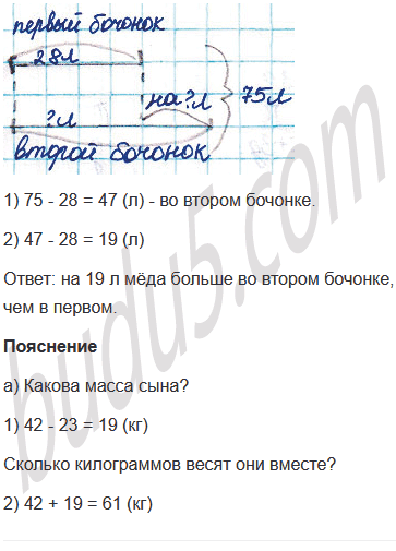 б) У мишки в двух бочонках 75 л мёда. В первом бочонке - 28 л. На сколько литров больше мёда во втором бочонке, чем в первом?