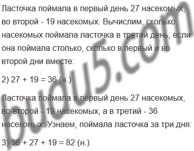 Задание № 10. Ласточка поймала в первый день 27 насекомых, во второй - на 8 насекомых меньше, чем в первый, а в третий - столько, сколько в первый и во второй дни вместе. Сколько насекомых поймала ласточка за три дня?