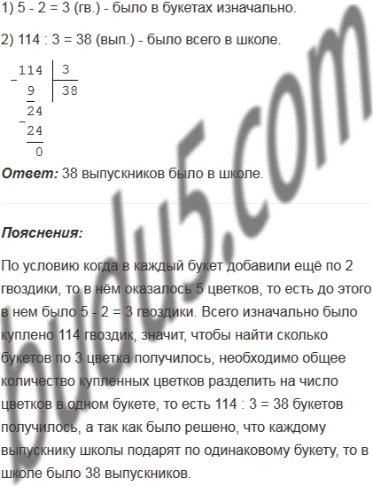 Каждому выпускнику школы решили подарить по одинаковому букету цветов. Для этого купили 114 гвоздик. Когда в каждый букет добавили ещё по 2 гвоздики, то в нём оказалось 5 цветков. Сколько выпускников было в школе?