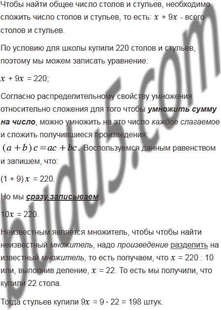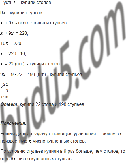 Для школы купили 220 столов и стульев, причём стульев - в 9 раз больше, чем столов. Сколько столов и сколько стульев купили?