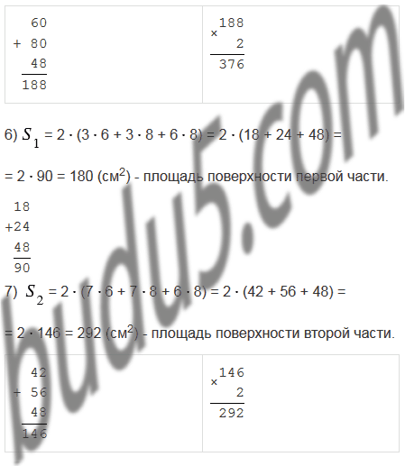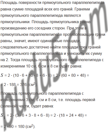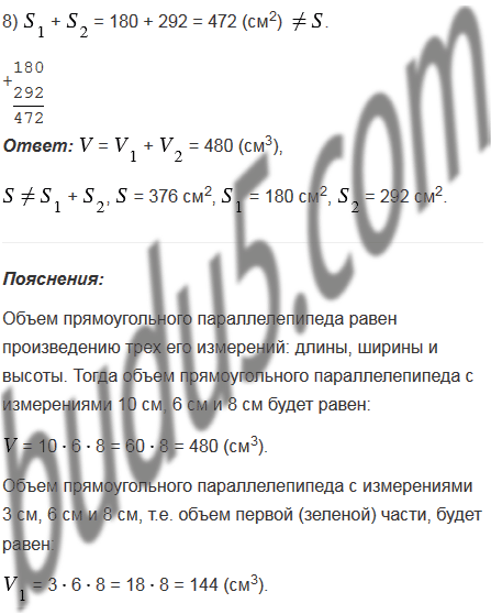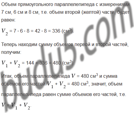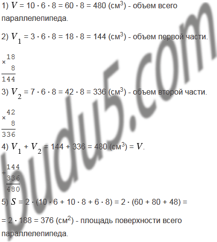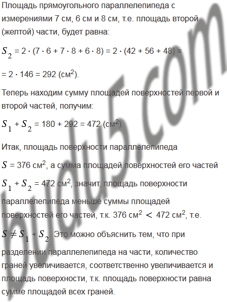 Прямоугольный параллелепипед (рис. 88) разделен на две части. Найдите объем и площадь поверхности всего параллелепипеда и обеих его частей. Равен ли объем параллелепипеда сумме объемов его частей? Можно ли это сказать о площадях их поверхностей? Объясните почему?