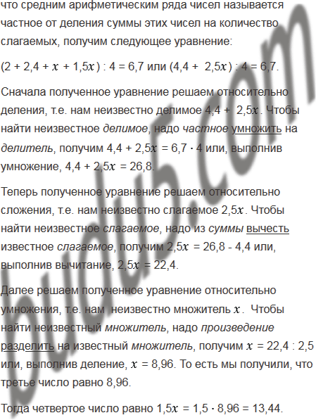 Среднее арифметическое четырёх чисел 6,7. Первое равно 2, второе в 1,2 раза больше первого, а третье меньше четвёртого в 1,5 раза. Найдите третье и четвёртое числа.