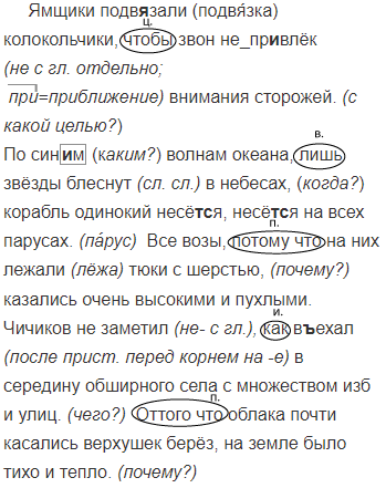 1. Ямщики подв..зали колокольчики чтобы звон (не)пр..влёк вн..мания сторожей. (А. Пушкин) 2. По син..м волнам океана лишь звёзды блес(?)нут в небесах корабль одинокий несёт(?)ся несёт(?)ся на всех п..русах. (М. Лермонтов) 3. Все возы потому что на них л..жали тюки с шерстью казались очень высокими и пухлыми. (А. Чехов) 4. Чичиков (не)заметил как в(?)ехал в середину обширного села с множеством изб и улиц. (Н. Гоголь) 5. Оттого что облака почти касались верхушек берёз, на земле было тихо и тепло. (К. Паустовский)