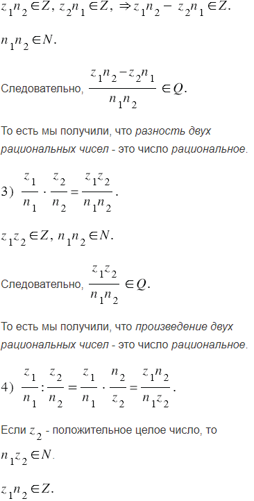Докажите, что сумма разность, произведение и частное двух рациональных чисел является рациональными числами.