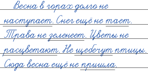 Весна в горах долго (не)наступает. Снег ещё (не)тает. Трава (не)зеленеет. Цветы (не)расцветают. (Не)щебечут птицы. Сюда весна ещё (не)пришла.