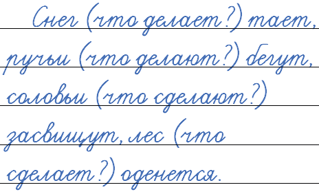Образец: Снег (что делает?) тает, ручьи (что делают?) ..., соловьи (что сделают?) ..., лес (...) ... .