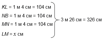 1) Длина ломаной KLMNB равна 3 м 26 см = 326 см. Отрезки KL, NB и MN равны 1 м 4 см = 104 см. Пусть длина отрезка LM равна