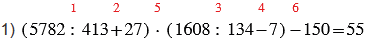 1) 5782:413 + 27)•(1608:134 - 7) - 150;