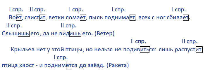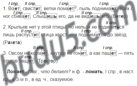 разберём третье предложение: Овсом не кормит (II спр.), кнутом не гонит (II спр.), а как пашет (I спр.) - пять плугов тащит (II спр.). (Трактор)