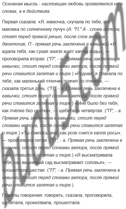 Первая сказала: «Я, мамочка, скучала по тебе, как маковка по солнечному лучу».(А: "П." А - слова автора, стоят перед прямой речью, после слов автора - двоеточие, П - прямая речь заключена в кавычки) «Я ждала тебя, как сухая земля ждёт каплю воды», — проговорила вторая. ("П", - а. Прямая речь заключена в кавычки, стоит перед словами автора, после прямой речи ставится запятая и тире.) «Родная, я плакала по тебе, как маленький птенчик плачет по птичке», — сказала третья дочь. ("П", - а. Прямая речь заключена в кавычки, стоит перед словами автора, после прямой речи ставится запятая и тире.) «Мне было без тебя, как пчёлке без цветка», — щебетала четвёртая. ("П", - а. Прямая речь заключена в кавычки, стоит перед словами автора, после прямой речи ставится запятая и тире.) «Ты снилась мне, как розе снится капля росы», — промолвила пятая. ("П", - а. Прямая речь заключена в кавычки, стоит перед словами автора, после прямой речи ставится запятая и тире.) «Я высматривала тебя, как вишнёвый сад высматривает соловья», — прошептала шестая. ("П", - а. Прямая речь заключена в кавычки, стоит перед словами автора, после прямой речи ставится запятая и тире.)