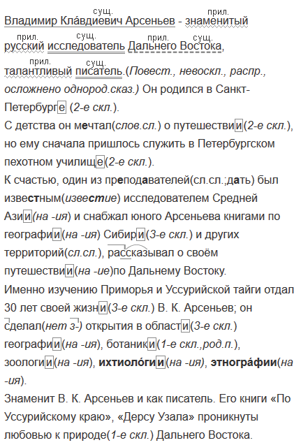Именно изучению Приморья и Уссурийской тайги отдал 30 лет своей (жизнь) В. К. Арсеньев; он (с, з)делал открытия в (область) (география, ботаника, зоология, ихтиоло́гия, этногра́фия).