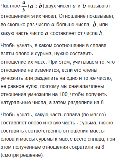 В каком соотношении в сплаве взяты олово и сурьма, если сплав содержит 3,76 кг олова и 0,8 кг сурьмы? Какую часть сплава (по массе) составляет олово и какую часть - сурьма?