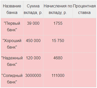 | Название банка | Сумма вклада, р. | Начисления по вкладу, р. | Процентная ставка |