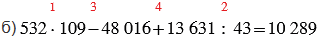 б) 532 • 109 - 48 016 + 13 631 : 43.