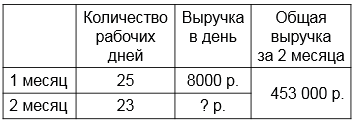 За два месяца работы мини-пекарни предприниматель получил выручку 453 000 р. В первый месяц предприниматель работал 25 дней и получал в день выручку 8000 р. Какую выручку в день получал предприниматель во второй месяц, если он работал 23 дня?
